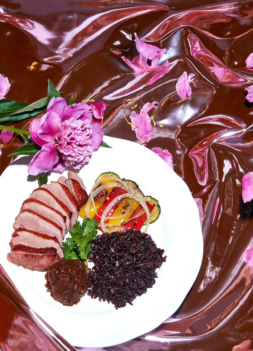 Minced pork and smoked bacon balls. Served with jasmine rice and sautéed vegetables.