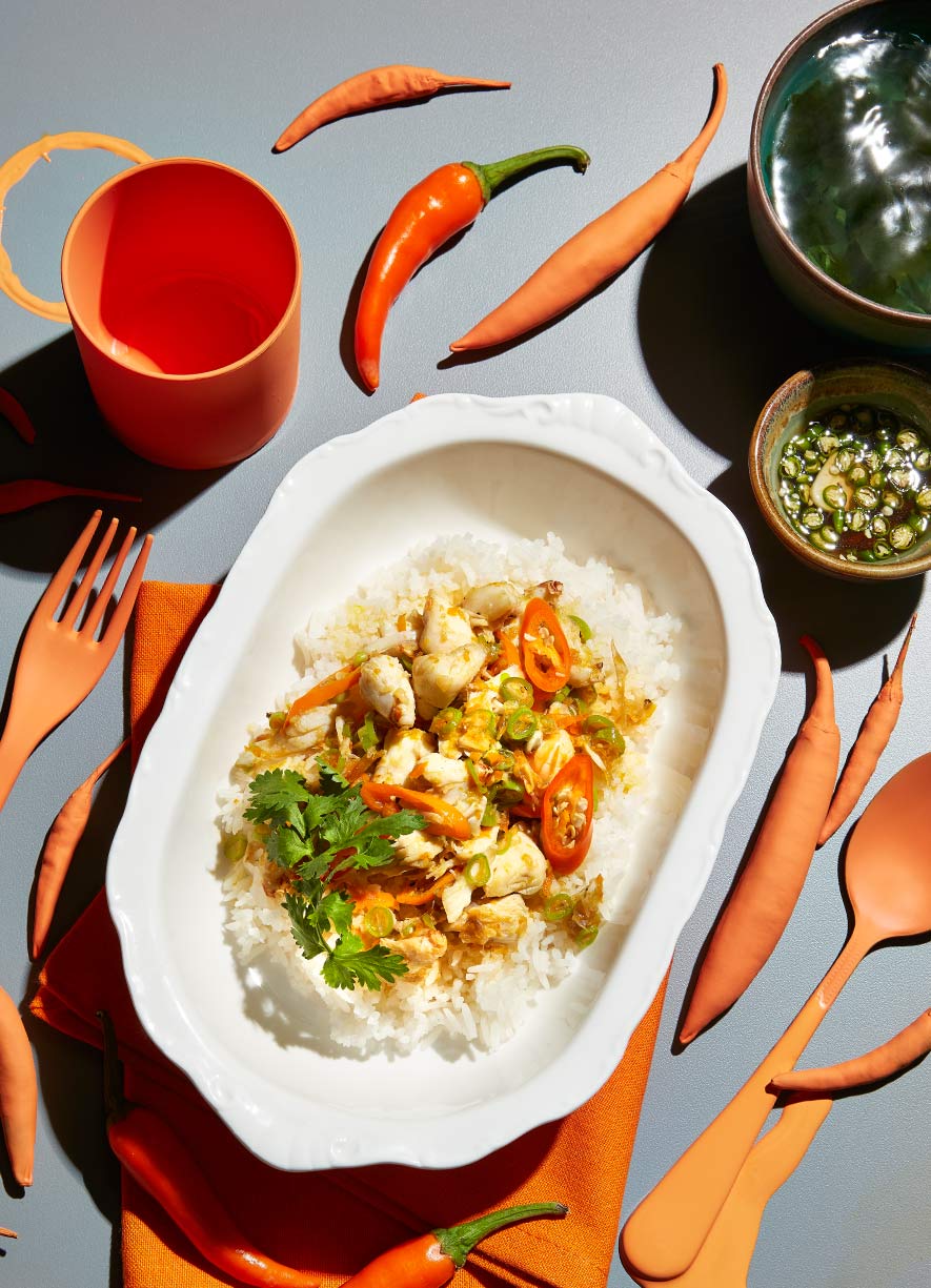 Stir-fried crab meat with garlic, yellow chilies and French beans. Served with jasmine rice and clear soup.