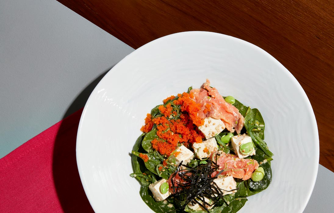 Baby spinach, soft tofu, Japanese seaweed, edamame, shrimp roe, smoked salmon and homemade sesame dressing.
