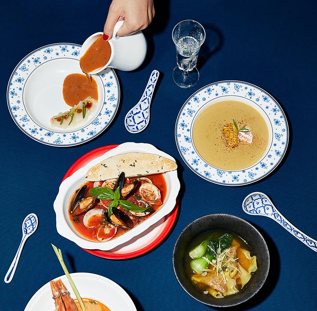 Famous Thai spicy soup with river prawn, shimeji mushroom, shrimp ravioli and aromatic Thai herbs.