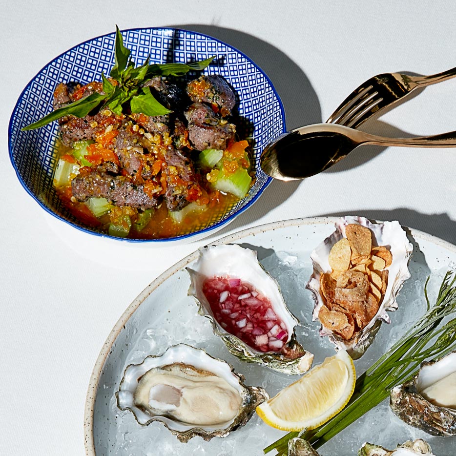 Barron Point premium size platter, fresh imported oysters. Served with red wine vinegar and Thai spicy sauce.